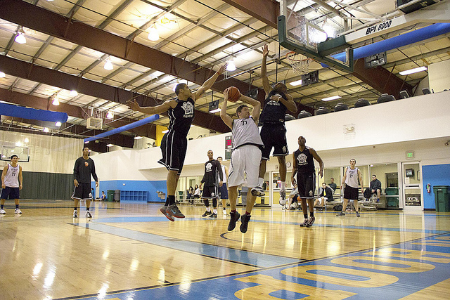 Law of Verticality (1 minute) If defender gets "in front of" an offensive player prior to that offensive player's final step of his move/shot, than that defender is entitled to (law of verticality) to the space behind him and 'to the ceiling'; in other words the defender can jump straight up (but- proof of jumping straight up- is that defender landed close to the same spot on floor when coming down). Important- for safety- to understand this concept of jumping straight up as opposed to jumping outward. |