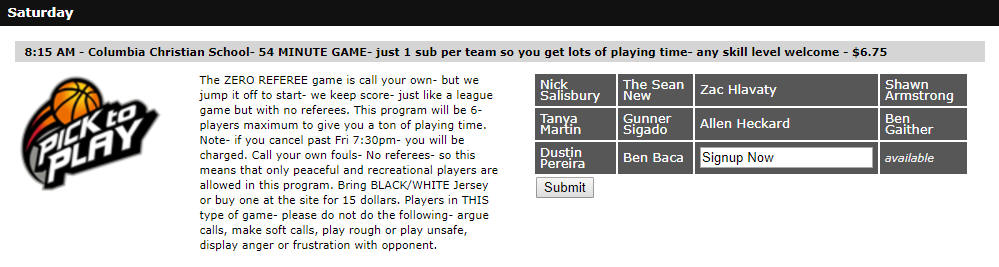 So... we came up with a system for open gyms- at PortlandBasketball.com whereby you will commit to a slot (time slot) per week but we will help you with your player-commitments per week (players who say they are IN)- with an online signup page (for your open gym- like you can see below)... and hopefully your open gym does not need us... but in the event your spots are not filling- we open the unfilled spots up to 'our people' so that the spots fill.